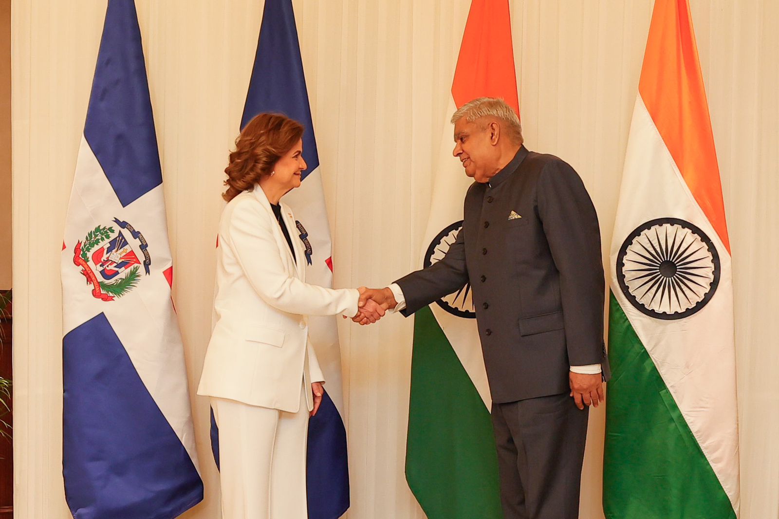 El vicepresidente de la República de India, Shri Jagdeep Dhankhar, y la vicepresidenta de la República Dominicana, . Raquel Peña , se reunieron en Nueva Delhi, India, el 4 de octubre de 2023, marcando un diálogo político de alto nivel entre los dos países, y mantuvieron discusiones productivas sobre asuntos bilaterales, regionales y multilaterales de interés mutuo. Esta visita es muy significativa ya que tiene lugar al tiempo en que la relación entra en el 25º año desde el establecimiento de relaciones diplomáticas el 4 de mayo de 1999.
